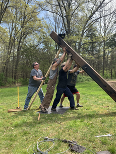 When you first come upon Jeff Mase’s work, you feel a sense of nostalgia for a simpler era. He uses basic common building blocks, materials from an industrial age gone by, which “catapult" us back in time. I use the word “catapult” in quotes for a reason. If you step back and look closer at the geometry, balance, counter balance, mass and weight, your feeling of nostalgia blends with a feeling of anticipation and suspense. You realize that the clean lines which form this simple geometry of thick cable, wood, steel and gravity are filled with Potential Energy and force….the force of a loaded catapult at rest, prior to release. Jeff's visual exploration of the duality of "calm intensity "innocently draws us in. His piece then introduces us to the philosophy of trying to maintain a balanced life under the laws of physics and our natural environment.